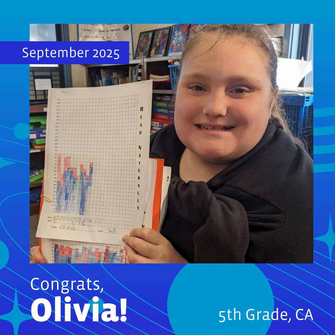 Congratulations to Olivia, our first Star of the Month for the 2025-2026 school year! Olivia is now a fifth grader at McAuliffe Elementary School in Riverside, CA. She has made amazing progress in Read Naturally programs over the last few years. Olivia's teacher, Aldrich Tan, nominated her last year and shared the following: