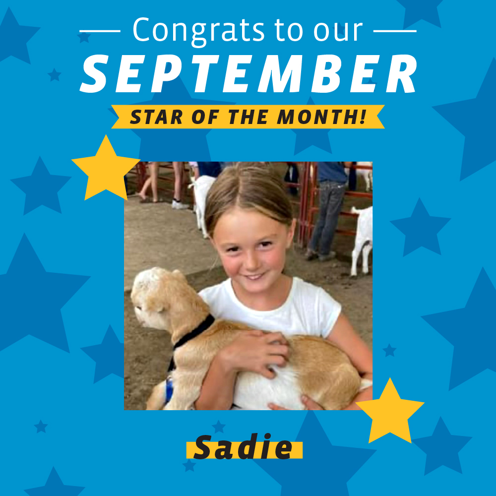 Congrats to our first Star of the Month for the 2023-2024 school year, Sadie! Sadie is a positive, hard-working third grader at Wynot Public Schools in Wynot, NE. Here is what Sadie's teacher, Ms. Steffen, had to say about her: