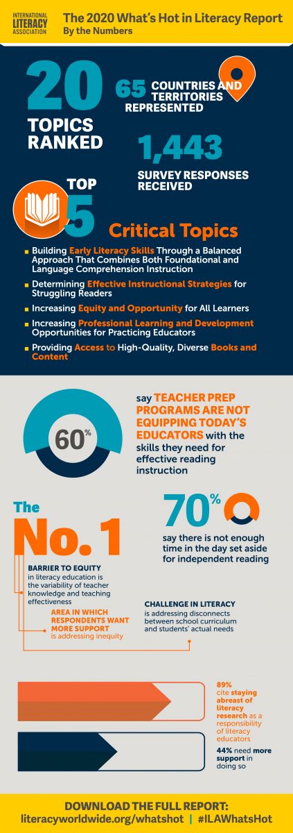 To advance literacy worldwide over the next decade, what topics do educators need to focus on? The International Literacy Association (ILA) recently put this question out to 1,443 literacy professionals from 65 countries and territories in the 2020 What’s Hot in Literacy survey. With the ultimate goal of better outcomes for students, this reputable report highlights the most critical topics in literacy and identifies areas that need more support.