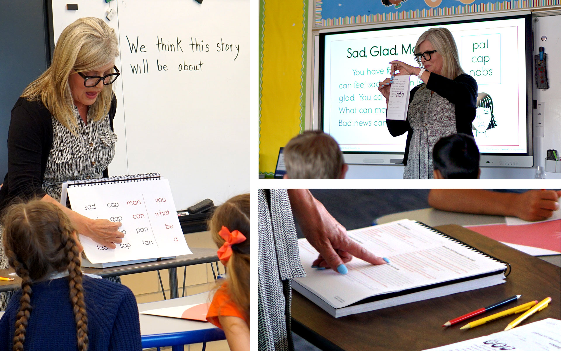 • Blend Sounds Into Words activity: Students listen as the teacher slowly blends letter sounds together to make a word, then the students say the word in unison.