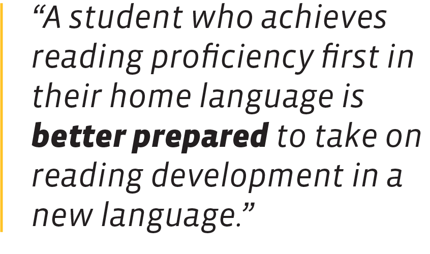 Oftentimes home languages are actively repressed in favor of the target language (English). Yet, we ought to take advantage of the language skills that a student does have. Home language literacy serves as a foundation for literacy in an additional language. A student should learn and practice reading skills first in the language that they are stronger in. Then they can build upon those strengths in a new language.