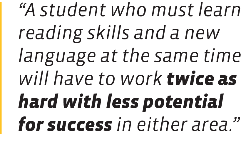 While grammar rules, letter sounds, and other factors differ between languages, the foundational reading skills developed in a student’s first language will transfer to the second language. A student who achieves reading proficiency first in their home language is better prepared to take on reading development in a new language. Conversely, a student who must learn reading skills and a new language at the same time will have to work twice as hard with less potential for success in either area (Short & Fitzsimmons, 2007). If the goal is for the student to be able to read in English more quickly and easily, the first step is literacy achievement in the home language.