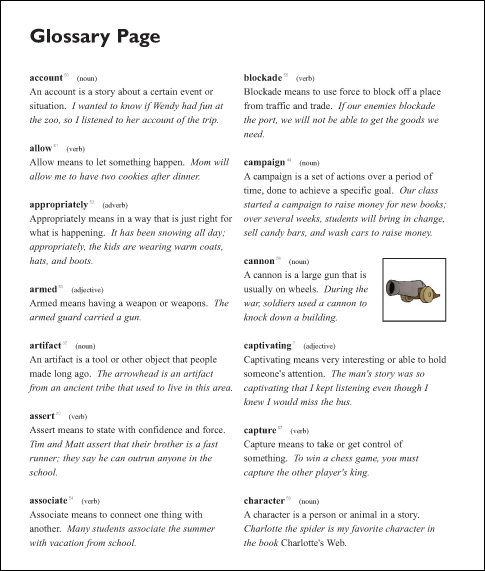 On the right is a sample page from the glossary for the Pirates! Unit. Notice that each term includes a student-friendly definition, and most glossary terms also include a clarifying sentence. Illustrations are also provided for many of the words. The glossary has audio support, which helps students build confidence with pronunciation and proper use of the words.