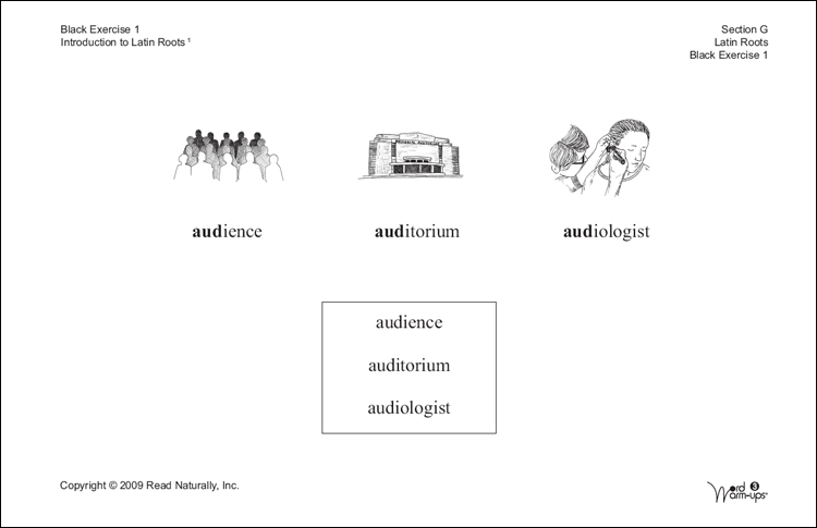 The introduction exercise extends phonemic awareness by presenting several words with illustrations that represent the featured prefixes, suffixes, syllables, or roots for the section. The featured prefixes, suffixes, syllables, or roots are in bold letters in the sample words. The words are presented again in a box at the bottom of the page without the featured parts in bold print.