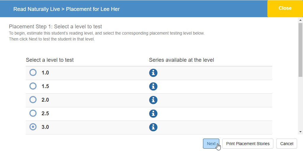 - Under Select a level to test, select the student's estimated instructional reading level based on any benchmark assessments and your experience with the student.