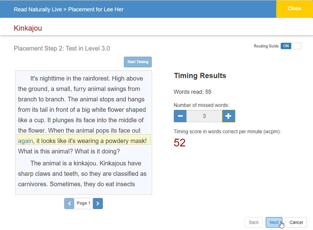 - As the student reads, listen and count the student's errors. If the bell sounds, tell the student to click on the last word they read. If the student finishes the story before the bell sounds, tell the student to click Finished.