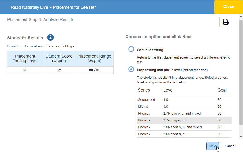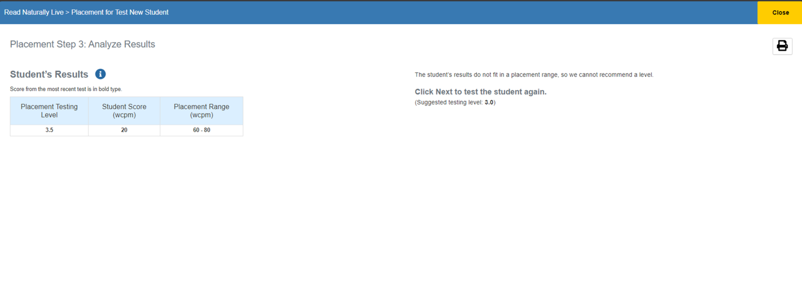 If the student's results are not within the placement range, click Next to continue with the suggested testing level.