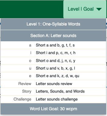The menu includes detailed information about the student's current level and section. The exercises in the section are listed, along with the skills taught in each exercise. Below the list of exercises, the student's current Word List Goal is displayed in words correct per minute.